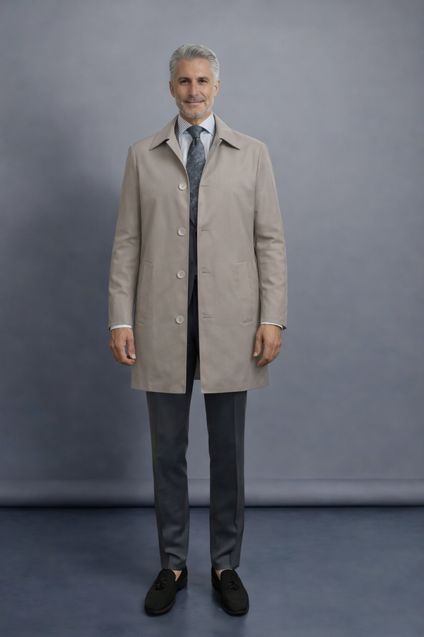 Denne frakke er skabt til manden, der vil have én løsning, der fungerer i alle sammenhænge. Det rene, minimalistiske design gør den oplagt over et klassisk suit, hvor den løfter helhedsindtrykket med et skarpt og sofistikeret udtryk. Samtidig fungerer den lige så stærkt i et mere afslappet look – over en strik og chinos, hvor den tilfører struktur og elegance uden at virke formel.